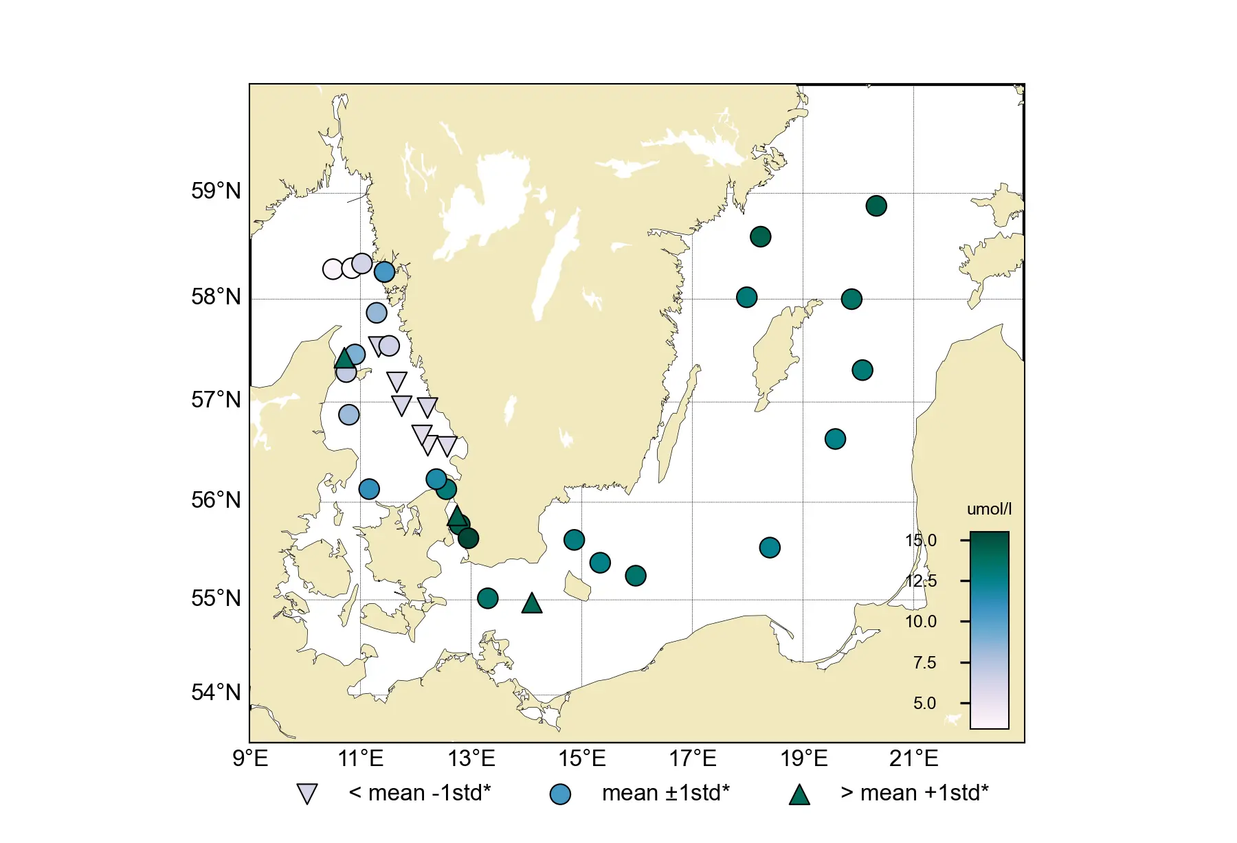I övrigt noterades för månaden normala halter av fosfat i stort sett hela Kattegatt på runt 0.5 – 0.7 µmol/l, medan silikathalterna var mer varierande med concentrationer från 4.9 – 15.5 µmol/l. De lägsta silikathalterna fanns framförallt i östra Kattegatt där de var lägre än normalt på runt 4.9 – 6.1 µmol/l.