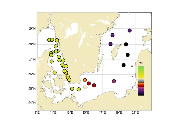I Bornholmsbassängen noterades syrebrist (<2 ml/l) under 60 m, men inget svavelväte uppmättes. I Hanöbukten fanns ett skikt närmast botten med en syrehalt på ca 2 ml/l, men ovanför det, vid 70 m något lägre halt. I Arkonabassängen var syresituationen god (6.2 – 6.9 ml/l) i bottenvattnet. Vid stationen BCSIII-10 uppmättes svavelväte på 80 – 90 m djup, och syrebrist från 70 m. BY10 och BY15 i Östra Gotlandsbassängen uppvisade syrebrist från 60 – 70 meters djup, svavelväte påträffades från 80 – 85 m och djupare. Halterna av svavelväte är fortsatt mycket över det normala i djupvattnet i Östra- och Västra Gotlandsbassängen.