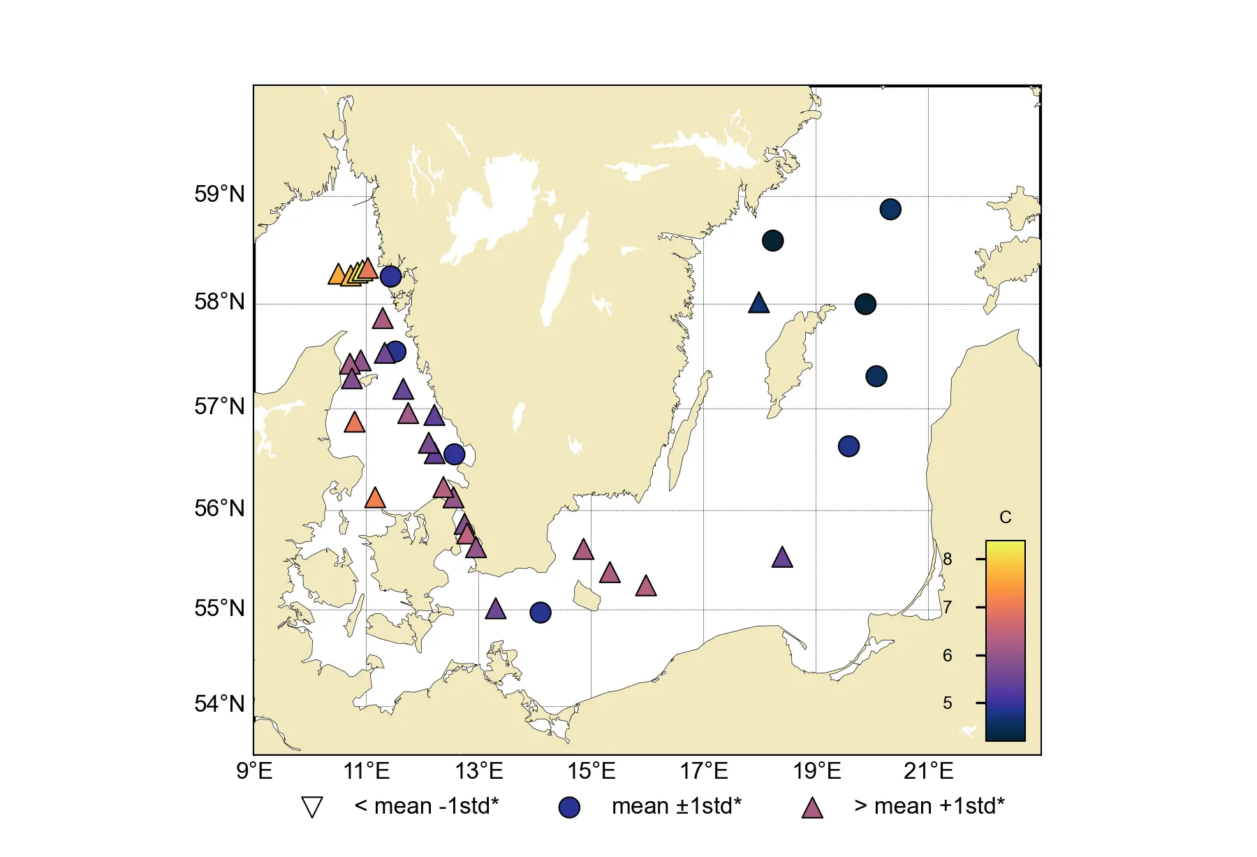 Temperaturen i ytvattnet i södra delarna av Östersjön var över det normala för månaden och låg mellan 4.9 – 6.4 °C. Längre norrut (BY10 – BY32) uppmättes ytvattentemperaturer mellan 4.2 – 4.8 °C som var normala för månaden.