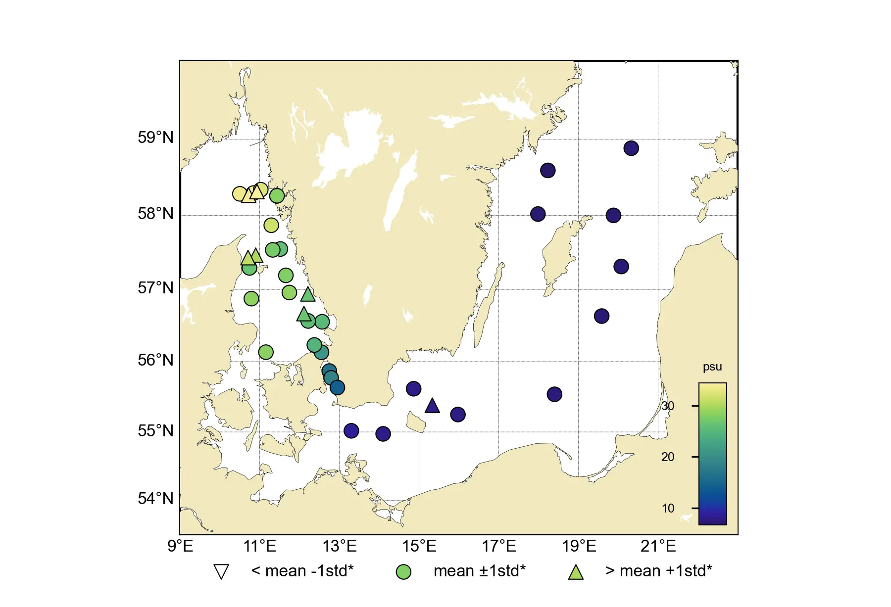 Salthalten i Östersjöns ytvatten varierade mellan 7.0 – 8.7 psu, vilket är normalt för månaden. I Arkonabassängen återfanns salthaltskiktningen mellan 20 – 30 meters djup, temperaturskiktningen var inte lika tydlig. I Hanöbukten och Bornholmsbassängen låg både salt- och temperaturskiktningen något djupare, mellan 40 – 50 m.