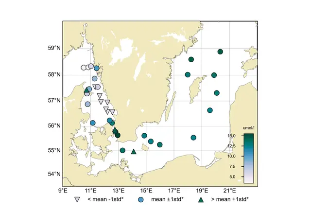Koncentrationerna av näringsämnen i ytvattnet låg kvar på höga vinternivåer i Skagerrak, en liten minskning av silikat kunde noteras men halterna var fortfarande inom, eller strax under det normala för månaden. I Kattegatt var halterna av näringsämnen i ytvattnet något låga för månaden. Östersjöns ytvatten visade fortsatt höga halter av näringsämnen över lag, men i östra (BY15 och BY20) och norra egentliga Östersjön (BY31) var halterna av löst oorganiskt kväve lägre än normalt för månaden.
