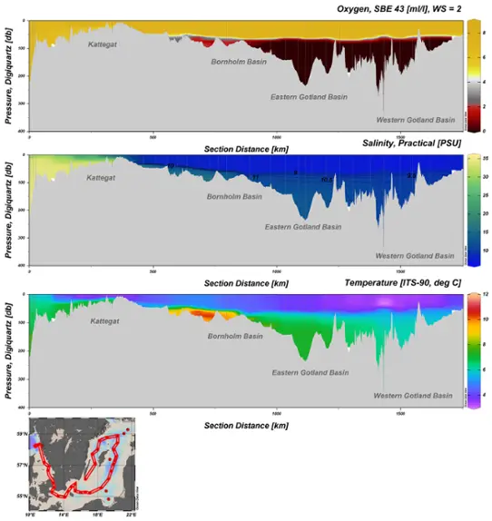 Vattnet var välblandat ned till 50–60 m djup där haloklinen började. Vid de grundare stationerna i Arkona låg haloklinen något grundare, kring 40 m. I djupvattnet var temperaturen över det normala medans salthalten var inom det normala. I Östra Gotlandsbassängen ökade halterna av näringsämnen och svavelväte kraftigt runt 125 m och var över det normala från 125 m och djupare. I Norra Egentliga Östersjön och Västra Gotlandsbassängen var halten av svavelväte fortfarande betydligt lägre än i Östra Gotlandsbassängen men trots detta över normalt och även halterna av näringsämnen ökade till över normalt vid den skarpa övergången mellan syresatt och syrefritt vatten också här. Svavelväte uppmättes vid samtliga stationer utom i Gdansk bukten, Bornholmsbassängen, Hanöbukten och Arkona bassängen. I Östra och Västra Gotlandsbassängerna var det syrefritt från 70–80 m medans det i Norra Egentliga Östersjön blev syrefritt på 90–100 m. I Arkona bassängen var bottenvattnet väl syresatt med halter mellan 5,5–7,8 ml/l. I Hanöbukten och Bornholmsbassängen förekom akut syrebrist intermediärt (<2 ml/l), i bottenvattnet var halterna högre och låg strax över 2 ml/l. Att halterna närmast botten var högre tyder på att nytt inflödande vatten nått området.