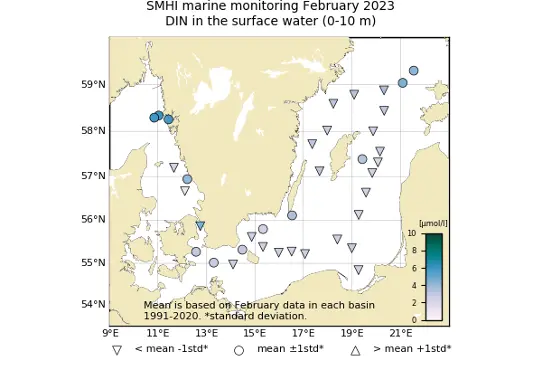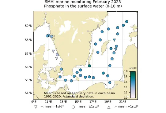 Jämfört med i januari hade inte koncentrationen av näringsämnen i ytvattnet ändrat särskilt mycket. Vid några stationer hade koncentrationen av löst oorganiskt kväve minskat något medans halten av fosfat hade ökat något vid samma stationer. I Norra Egentliga Östersjön syntes en liten ökning av både fosfat och löst oorganiskt kväve.