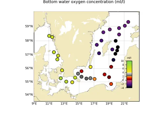 Förstora bildenFigur: Syrekoncentrationen (ml/l) i bottenvattnet. Den senaste syremätningen jämförs inte med tidigare mätningar och visar därmed inte om värdet är över eller under det normala för månaden genom färgfyllda trianglar. Alla värden visas istället som färgfyllda cirklar.