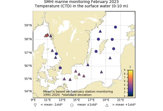 Förstora bildenFigur: Temperaturen i ytvattnet (0-10m).