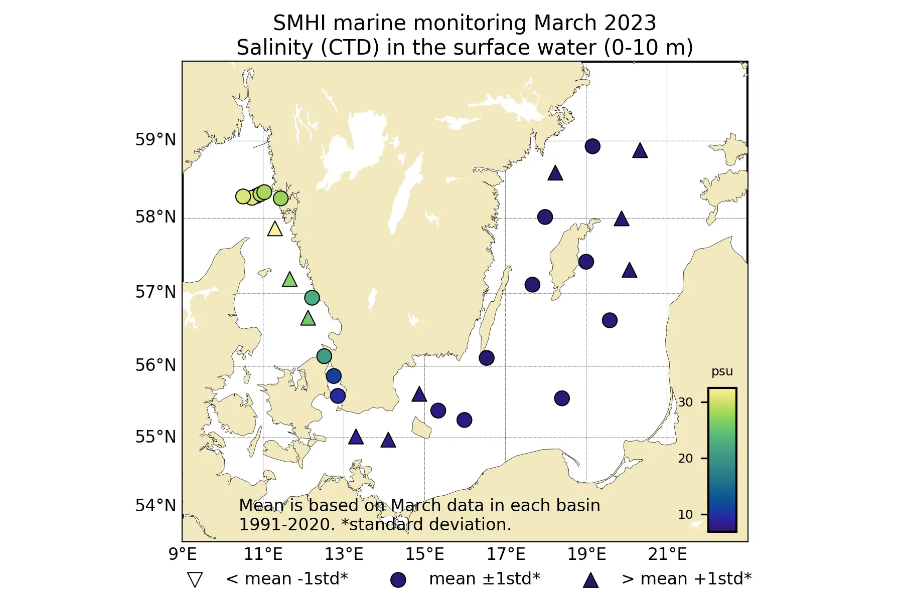Ytvattnet var välblandat ned till 50–70 m djup där haloklinen började. Vid de grundare stationerna i Arkonabassängen låg haloklinen, kring 40 m. I djupvattnet var temperaturen över det normala medans salthalten var inom det normala eller strax över normalt. Precis som i februari ökade halterna av näringsämnen och svavelväte kraftigt runt 125 m och var över det normala djupare ned i Östra Gotlandsbassängen. I Norra Egentliga Östersjön och Västra Gotlandsbassängen var halten av svavelväte fortsatt lägre än i Östra Gotlandsbassängen men högre än normalt i dessa bassänger. Även halterna av näringsämnen ökade till över normalt vid den skarpa övergången mellan syresatt och syrefritt vatten. Svavelväte uppmättes vid samtliga stationer utom i Bornholmsbassängen, Hanöbukten och Arkonabassängen. Vid BCSIII-10 i sydöstra Östersjön hade syresituationen försämrats i djupvattnet där det i februari var syresatt återfanns nu åter helt syrefria förhållanden och svavelväte uppmättes från 80 m djup. I Östra och Västra Gotlandsbassängerna var det syrefritt från 70–80 m medans det i Norra Egentliga Östersjön blev syrefritt på ca 80 m. I Arkona bassängen var bottenvattnet väl syresatt med halter över 6-7 ml/l. I Hanöbukten och Bornholmsbassängen förekom akut syrebrist (<2 ml/l) från djup överstigande 60-80m och i bottenvattnet var halterna omkring 2 ml/l. Jämfört med syremätningarna i februari, då ett inflöde tydligt påverkade syresituationen positivt, var nu syresituationen åter på väg att försämrats. Den försämring av syreförhållandena som noterades vid BCSIII-10 kan eventuellt kopplas till detta inflöde då syrefritt vatten från Bornholmsbassängen pressas in mot de centrala delarna av Östersjön innan inflödet når området.