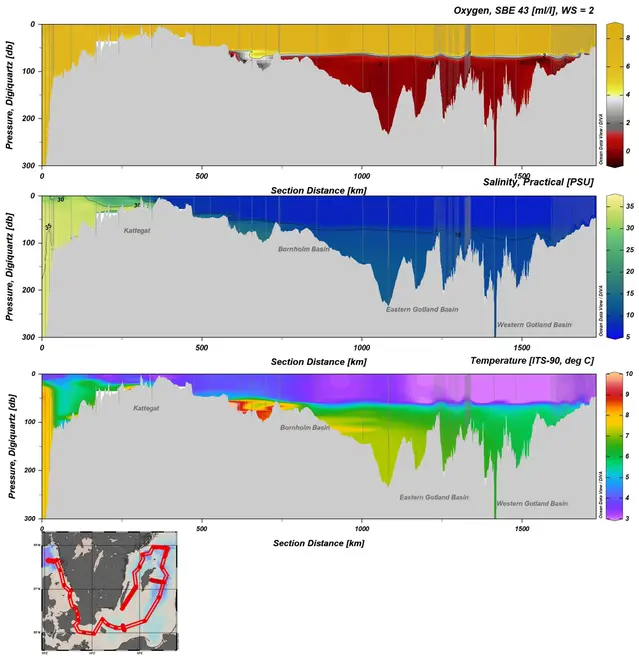 Förstora bildenFigur: Snitt som visar syrekoncentration, salthalt och temperatur från mätningar med CTD och MVP, från Skagerrak till Östra Gotlandsbassängen och vidare in i Västra Gotlandsbassängen.