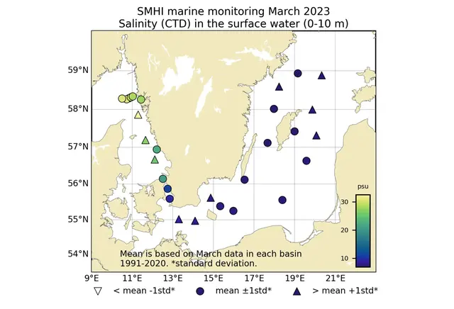 Temperaturen i ytvattnet (0–10 m) i Kattegatt och Öresund var normal för årstiden. Jämfört med mätningarna i februari var temperaturen oförändrad eller hade minskat något och varierade mellan 3–4°C. Salthalten i ytvattnet var högre än normalt i de norra och centrala delarna av Kattegatt, 26-27 psu medan normala värden noterades i Öresund, 10-21 psu. I Kattegatt fanns ett temperatur- och salthaltssprångskikt, på 10–20 m.