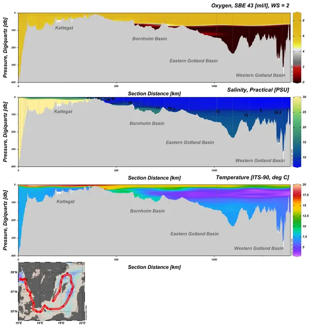 Förstora bildenFigur: Snitt som visar syrekoncentration, salthalt och temperatur från mätningar med CTD och MVP, från Skagerrak till Östra Gotlandsbassängen och vidare in i Västra Gotlandsbassängen.