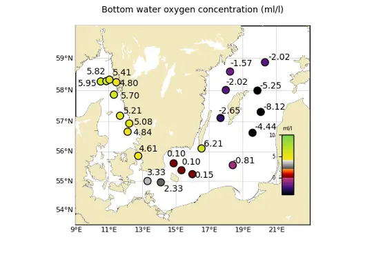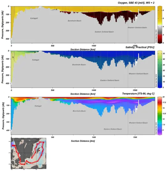 I Bornholmsbassängen rådde syrefria förhållanden från 80 meters djup, dock noterades endast låga halter av svavelväte i bottenvattnet.