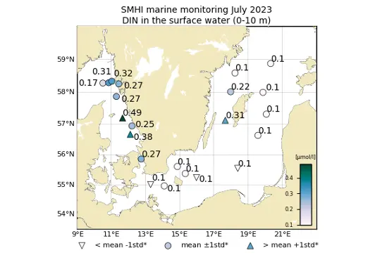 Halterna av löst oorganiskt kväve (DIN) i vattnet låg runt det normala, och hade minskat något sedan expedition i juni. Samtliga stationer låg på nivåer under rapporteringsgräns, <0,10 µmol/l, med undantag av BY39 och BY32, där 0,33 µmol/l respektive 0,22 µmol/l uppmättes. I Västra och Östra Gotlandsbassängen observerades halter löst oorganiskt kväve över det normala i djupvattnet, där BY31 uppvisade halter mycket över det normala nedanför 75 meters djup. På stationerna i Egentliga Östersjön sammanföll ökningen av DIN i djupvattnet på de djup där syrefria förhållanden uppstod.