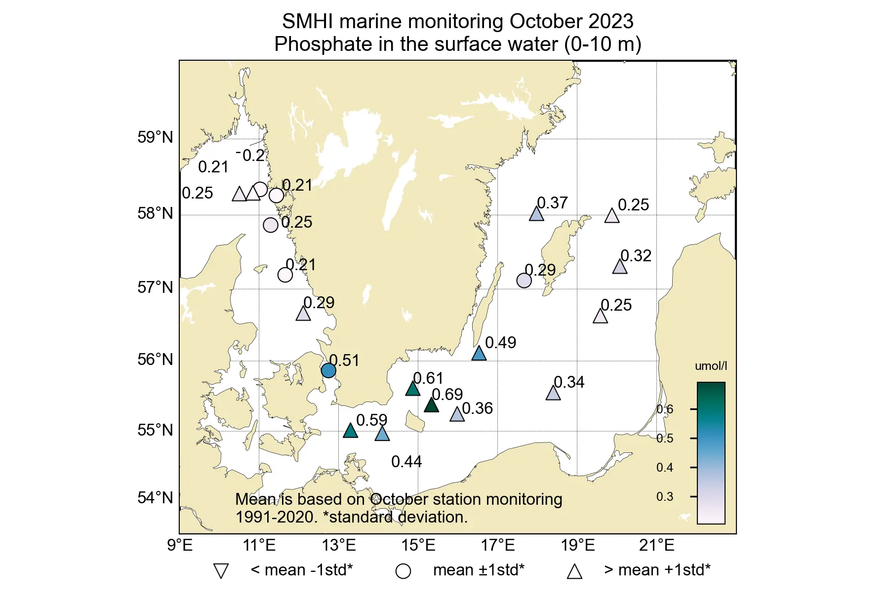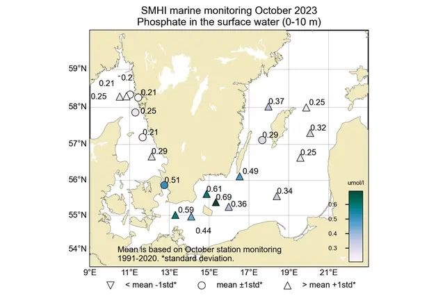 Förstora bildenFigur: Koncentrationen (µmol/l) av fosfat i ytvattnet (0-10 m).