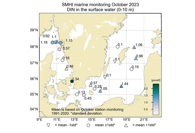 Förstora bildenFigur: Koncentrationen (µmol/l) av oorganiskt kväve i ytvattnet (0-10 m).