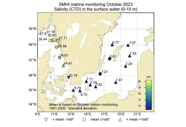 Förstora bildenFigur: Salthalten i ytvattnet (0-10m).