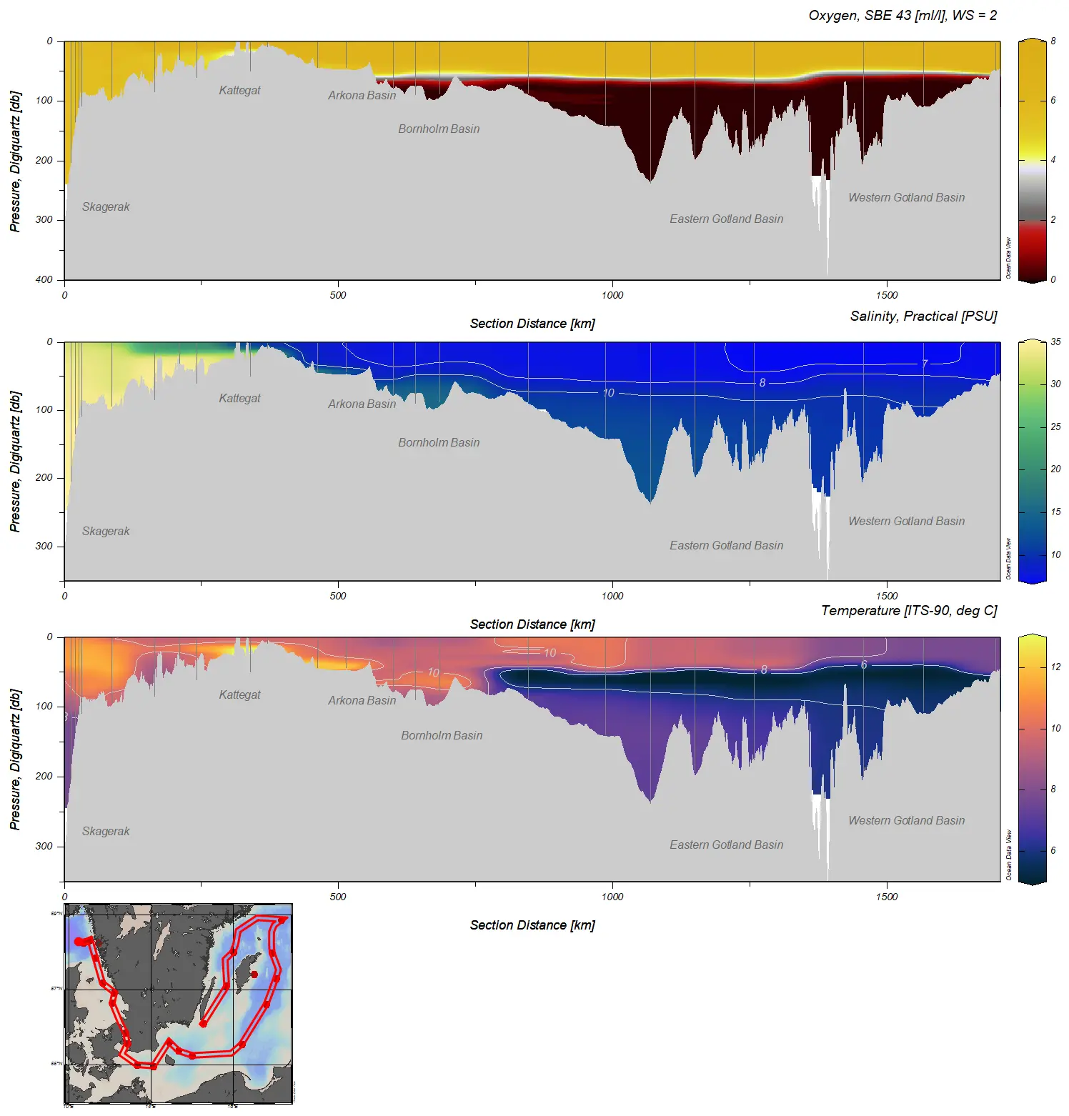 Förstora bildenFigur: Snitt som visar syrekoncentration, salthalt och temperatur från mätningar med CTD och MVP, från Skagerrak till Östra Gotlandsbassängen och vidare in i Västra Gotlandsbassängen.