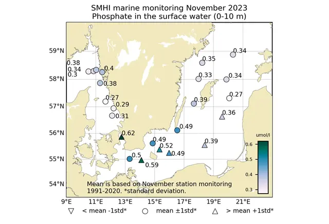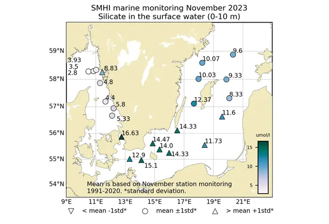 I samband med stormen Babet i oktober blandades ytvattnet om och koncentrationen av näringsämnen steg i ytvattnet. Nu i november hade koncentrationerna vid flera stationer minskat men de var fortfarande över det normala vid en del stationer. Koncentrationen av fosfat och silikat var över det normala i sydöstra Egentliga Östersjön, Bornholmsbassängen och Arkonabassängen. Koncentrationen av DIN var över det normala i Östra Gotlandsbassängen och norra Egentliga Östersjön. I västra Arkonabassängen samt Hanöbukten var DIN istället under det normala.
