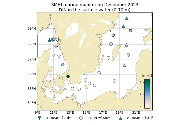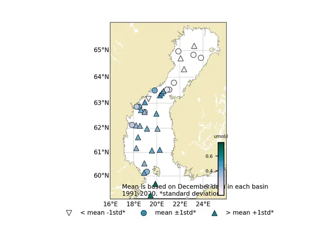 Normalt ökar koncentrationen av lösta oorganiska näringsämnen under vintern, men i december hade koncentrationerna av både fosfat och löst oorganiskt kväve minskat vid flera stationer i Skagerrak. I Kattegatt hade dock koncentrationen av oorganiska näringsämnen ökat sedan november, vilket är normalt. I Egentliga Östersjön hade koncentrationen av näringsämnen ökat i ytlagret sedan november. Halterna låg inom det normala för säsongen, med undantag av Norra Egentliga Östersjön där halterna var högre än normalt.