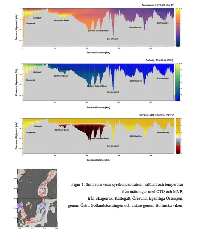 I Egentliga Östersjöns bassänger rådde syrefria förhållanden från 60 - 80 meter, vilket sammanföll med uppmätta halter av svavelväte. Liknande förhållanden kunde noteras i Bornholmsbassängen och i Hanöbukten. I Arkonabassängen var syresituationen i bottenvattnet däremot god.