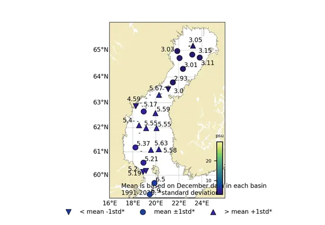 Salthalten i ytvattnet var i stort normal för årstiden men lägre halter noterades längs den svenska kusten samt högre halter än normalt noterades närmast finska kusten i de sydöstra delarna. Ytsalthalten varierade mellan 4,6 och 5,6 psu. Likt temperaturen, kunde ingen tydlig salthaltsskiktning observeras, med något ökande salthalter mot botten med salthalter mellan 6 - 7 psu i bottenvattnet.