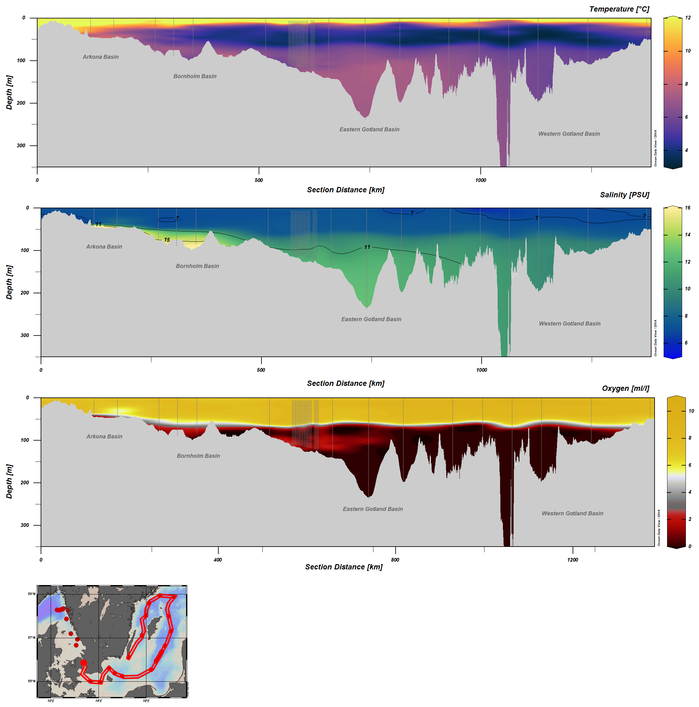 Vid några stationer återfanns ett välblandat ytskikt med jämn temperatur ner till 10 meter, medan det vid andra saknades ett homogent ytskikt. Eventuellt kan detta bero på att viss omblandning sker av båten i samband med mätning vilket då kan påverka tunna ytskikt. Den mer permanenta skiktningen för både temperatur och salthalt återfanns på 60–80 meters djup i både Östra och Västra Gotlandsbassängen. I dessa bassänger var temperaturen i djupvattnet i flera fall över det normala, vilket syns i vertikalprofilerna för t ex BY31 och BY29. I de grundare bassängerna i syd och sydväst återfanns skiktningen inte lika djup, och mer homogena skikt med avseende på salthalt och temperatur förekom inte på samma sätt som i de djupare bassängerna. Salthalt och temperatur höll sig mestadels inom det normala i de sydligare bassängers djupare vattenmassor.