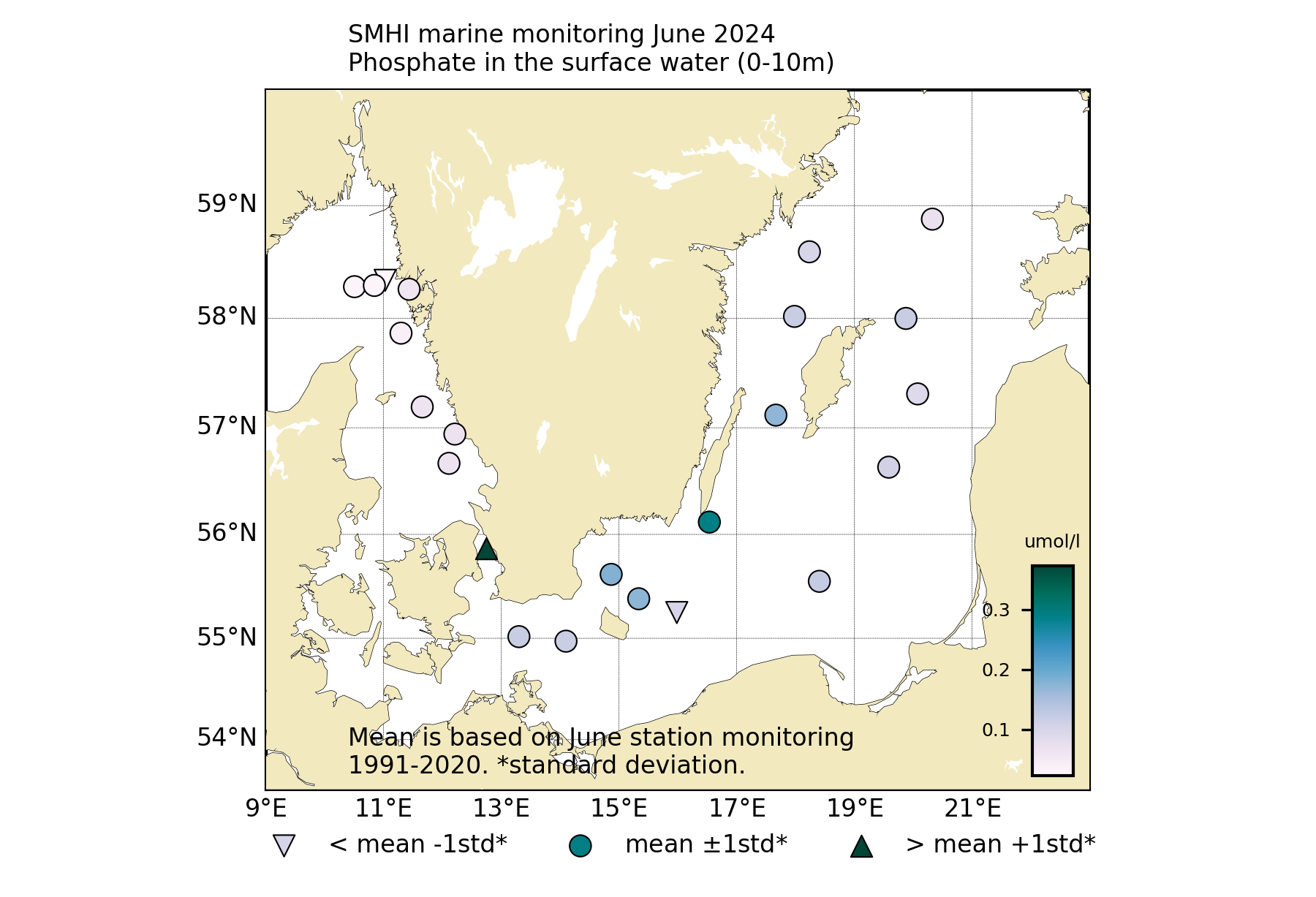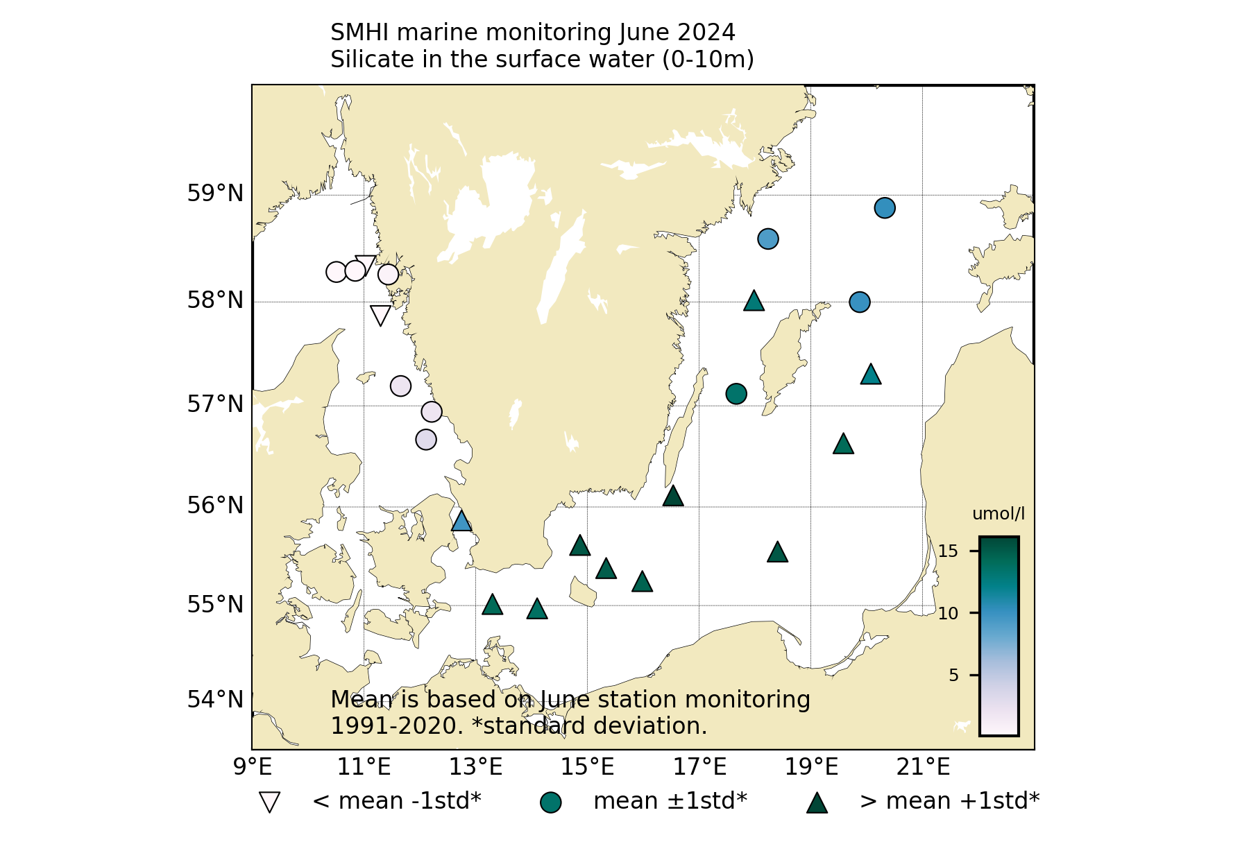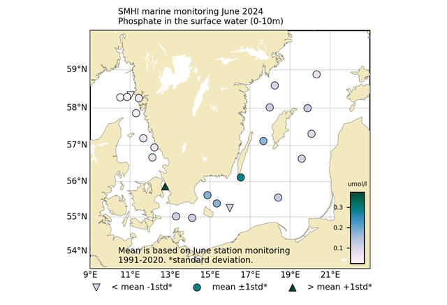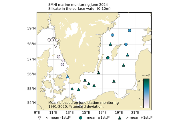 Koncentration av näringsämnen i form av löst oorganiskt fosfor (fosfat) och löst oorganiskt kväve i ytvattnet var med få undantag normala för årstiden i undersökta havsområden. För kisel i form av silikat var nivåerna för stora delarna av Egentliga Östersjön samt Öresund över det normala, medan det i Västerhavet var normala eller något under normala nivåer.