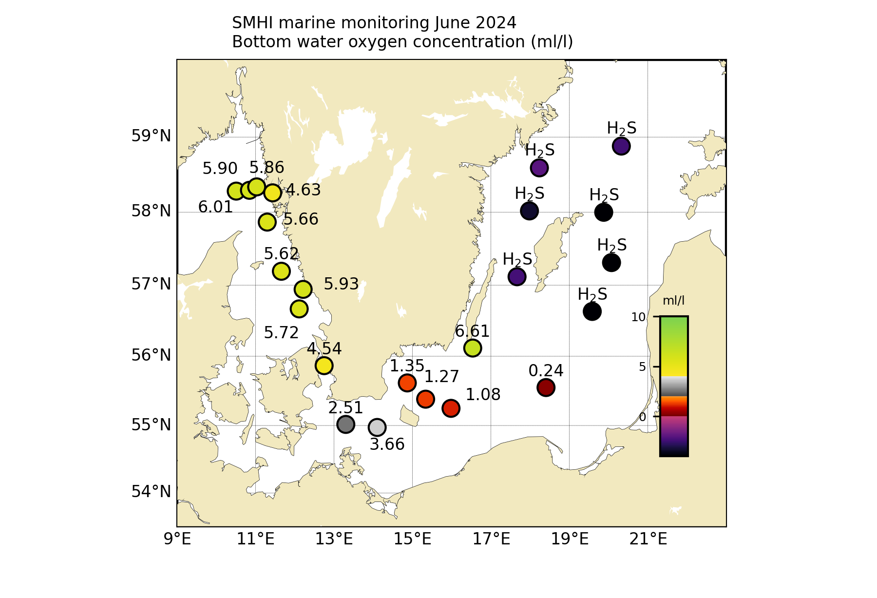 Syresituationen i Västerhavet, samt Arkonabassängen, var god. I Hanöbukten och Bornholmsbassängen samt vid stationen i sydöstra Östersjön uppmättes akut syrebrist (<2 ml/l). I både Västra och Östra Gotlandsbassängen förekom akut syrebrist vid 70 meters djup, och vid 80 respektive 90 meters djup förekom svavelväte i Västra respektive Östra Gotlandsbassängen. Halterna av svavelväte var i fler fall över det normala.