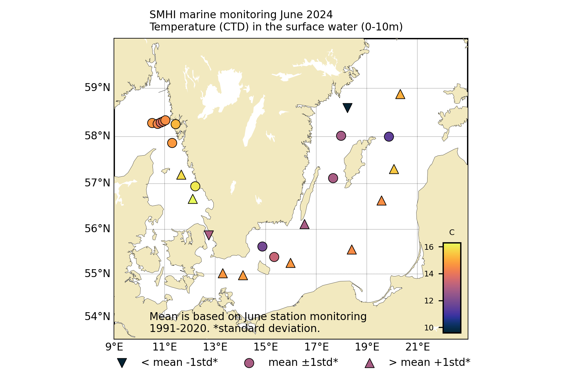 Förstora bildenFigur: Temperaturen i ytvattnet (0-10 m).