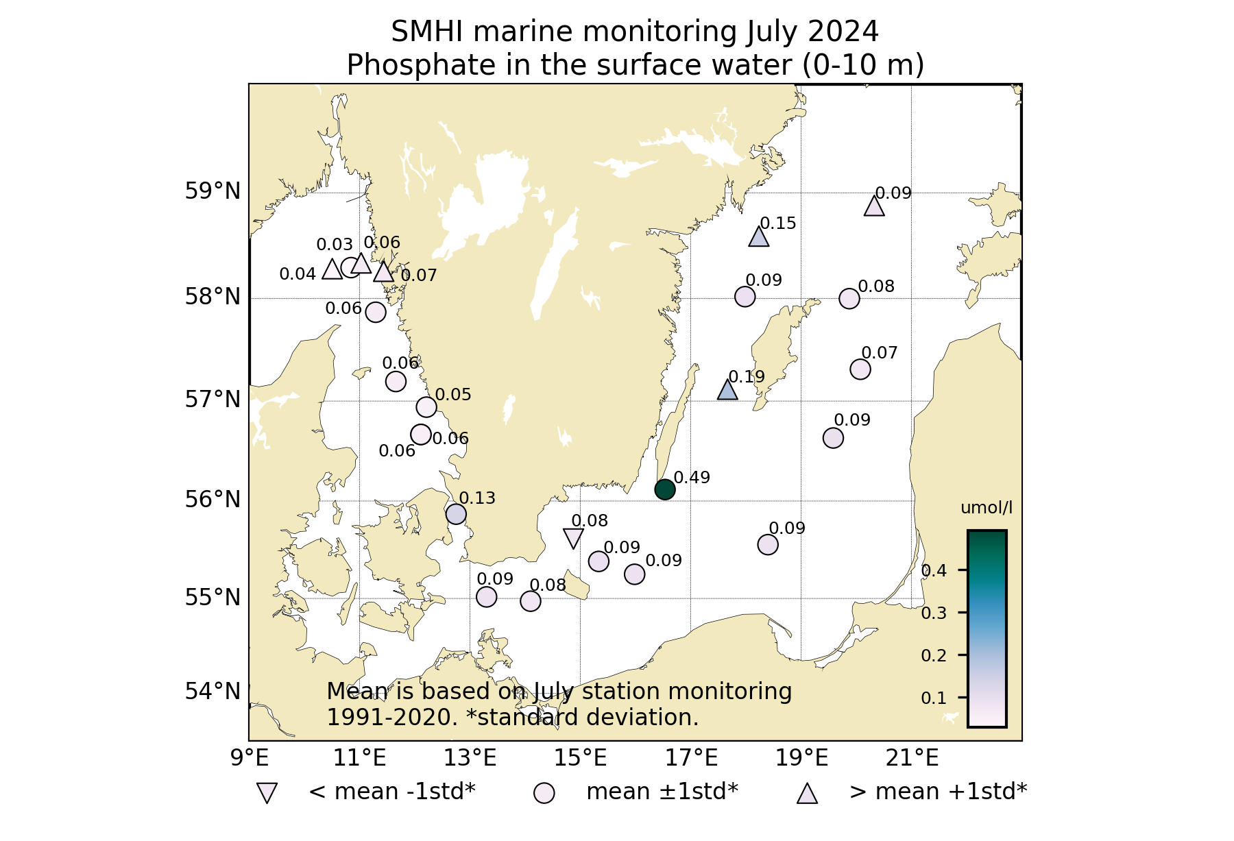 Fostfathalten i ytvattnet var normal för säsongen på de flesta stationerna och varierade mellan 0,07 – 0,49 µmol/l. I Västra Gotlandsbassängen noterades högre fosfathalter än normalt.