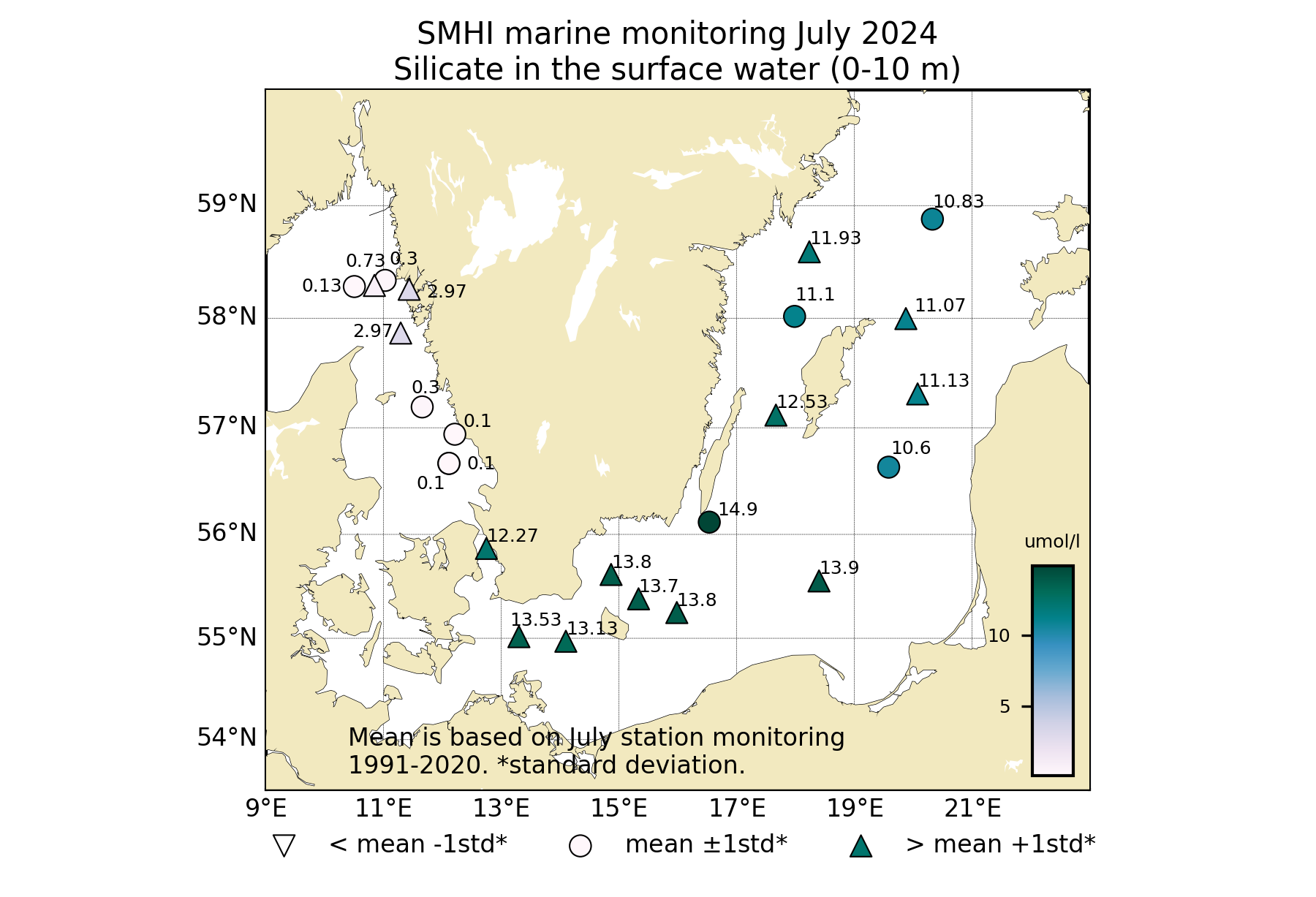 Koncentrationen av kisel i ytvattnet var något över till över det normala på samtliga stationer, med koncentrationer mellan 10,6 – 14,9 µmol/l.