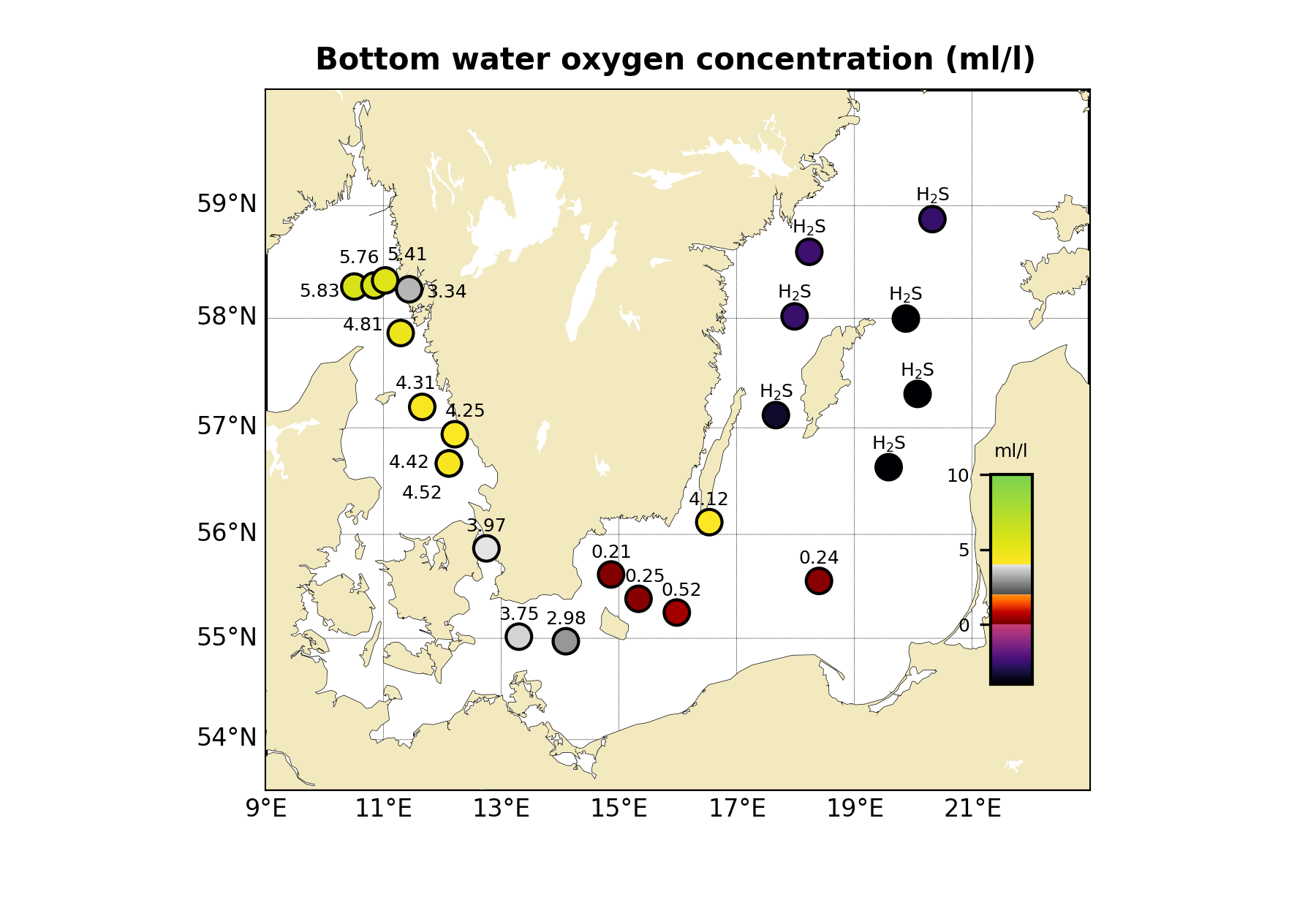 Akut syrebrist, det vill säga syrehalter mindre än 2 ml/l, noterades från 55 - 75 meter i Västra och Östra Gotlandsbassängen med undantag av den grunda stationen BY39. Svavelväte uppmättes från 70 till 80 meters djup i Västra Gotlandsbassängen och från 80 till 125 meters djup i Östra Gotlandsbassängen.