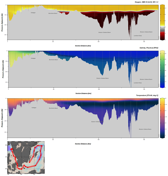 Förstora bildenFigur: Snitt som visar syrekoncentration, salthalt och temperatur från mätningar med CTD och MVP, från Skagerrak till Östra Gotlandsbassängen och vidare in i Västra Gotlandsbassängen..