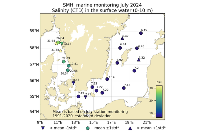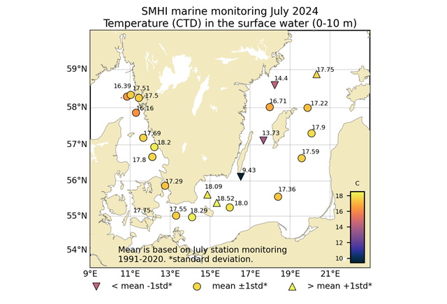 Ytvattentemperaturerna i samtliga havsområden låg runt det normala, mellan 13,7 – 18,6 ℃, utom för BY39 Ölands södra udde där den var 9,4 ℃, vilket är under det normala.