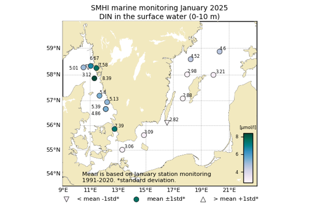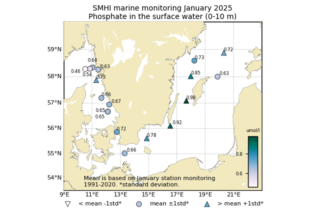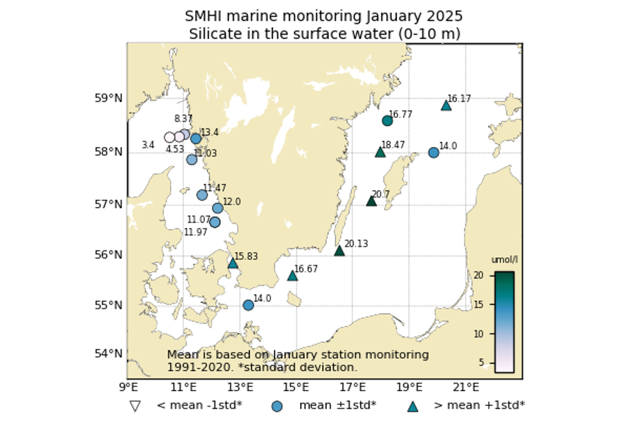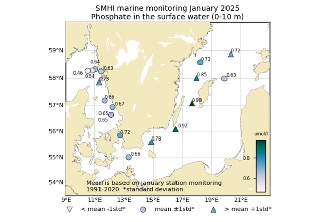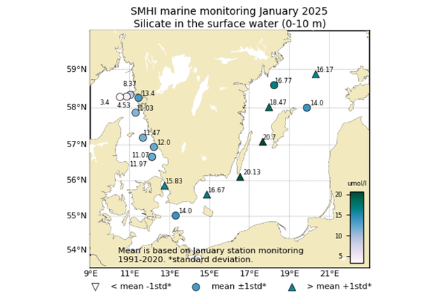 Koncentrationerna av fosfat och löst oorganiskt kväve (DIN) i Egentliga Östersjöns ytvatten har fortsatt öka sedan december och ligger nu kring 0,6 – 1,0 µmol/l och 2,8 – 4,6 µmol/l respektive. De högsta halterna av fosfat observerades i Bornholms- och Västra Gotlandsbassängen och var över det normala för månaden, vilket kan förklaras av att näringsrikt djupvatten blandats upp av uppvällningen. Även i Hanöbukten var fosfathalterna i ytvattnet högre än normalt för månaden. Halten DIN var lägre än normalt vid stationen BY38 i december och så även nu i januari, medan resten av Östersjön uppvisade normala halter. Koncentrationen av kisel i ytvattnet låg mellan 13 – 21 µmol/l med halter över det normala för månaden i Hanöbukten, Bornholms- och Västra Gotlandsbassängen.