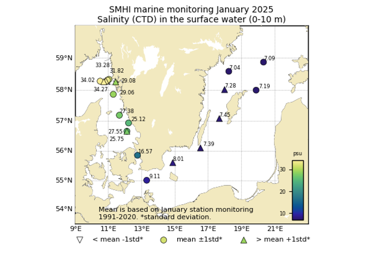 Salthalten i ytvattnet var inom det normala, mellan 7 – 9 psu i hela Östersjön förutom i Västra Gotlandsbassängen där något förhöjda värden observerades, detta indikerar att djupvatten med högre salthalt har pressats upp s.k. uppvällning längs Gotlands västra kust efter några dagars kraftiga vindar som påverkat området.