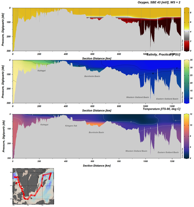 Förstora bildenFigur: Snitt som visar syrekoncentration, salthalt och temperatur från mätningar med CTD och MVP, från Skagerrak till Östra Gotlandsbassängen och vidare in i Västra Gotlandsbassängen.