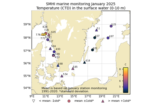 Avkylningen av ytvattnet fortsatte i januari men temperaturen var över normal vid de flesta stationer utom i Öresund och runt Gotland. Temperaturen i ytvattnet låg kring 5 till 8 grader i Västerhavet och 4 till 8 grader i Egentliga Östersjön.