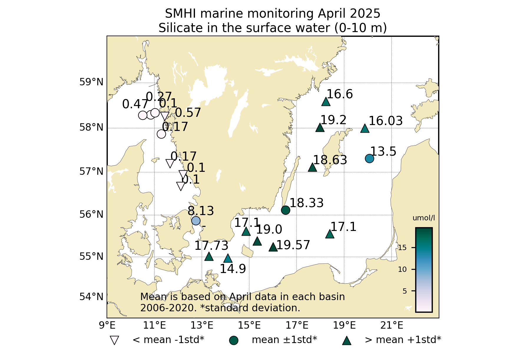 Halterna av oorganiskt kväve (DIN) varierade mellan 0,1 - 1,0 µmol/l, fosfat omkring 0,1 µmol/l och kisel 0,1 – 0,57 µmol/l. Minskningen av näringsämnen i ytvattnet är en indikation på att vårblomningen fortsätter i ytvattnet.