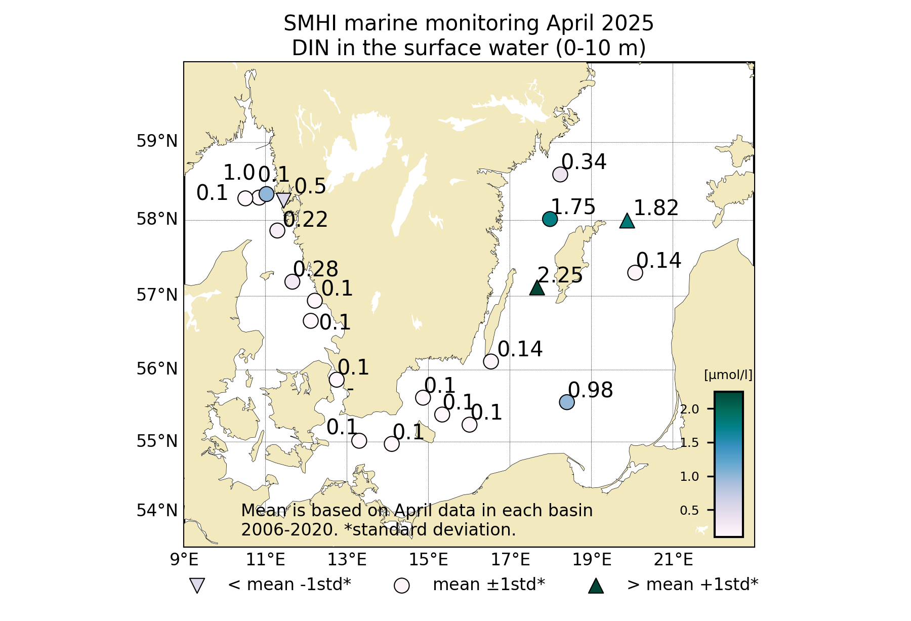 Koncentrationen av löst oorganiskt kväve var inom det normala vid alla stationer och hade minskat sedan i mars, sannolikt i samband med inledning av vårblomning. Koncentrationen var lägst i de södra bassängerna och ökade norrut, och varierade mellan 0,1–1,8 μmol/l, där halterna låg inom de normala undantaget BY38, där halterna av DIN var högre än normalt för årstiden på 2,3 μmol/l.