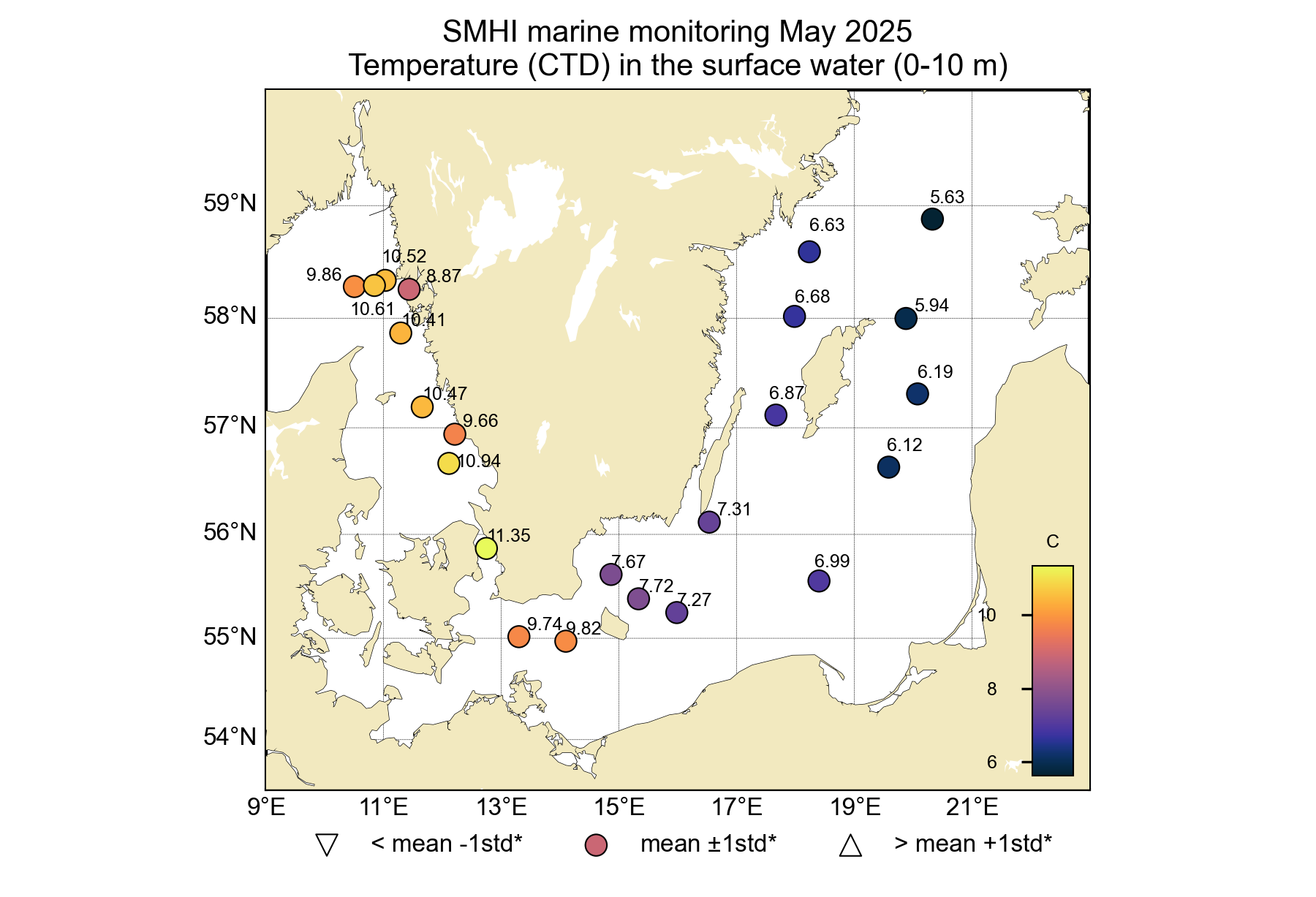 Temperaturen i ytvattnet var vid de flesta stationer normal för månaden och varierade mellan 9 – 11 °C i Västerhavet och 6 – 10 °C i Egentliga Östersjön. I Västerhavet hade en svag termoklin börjat byggas upp med varmare ytvatten medan det i Egentliga Östersjön var mer välblandat och kallare ner till haloklinen.