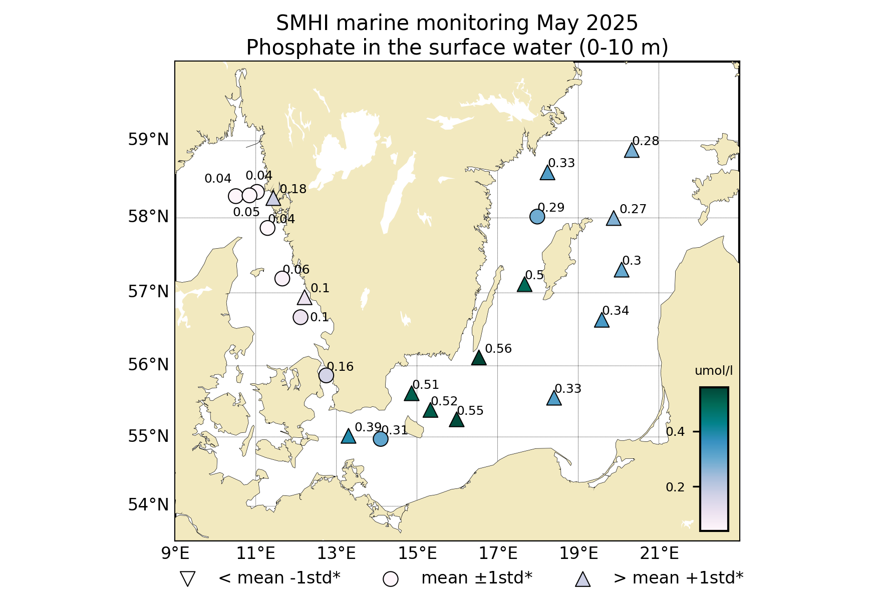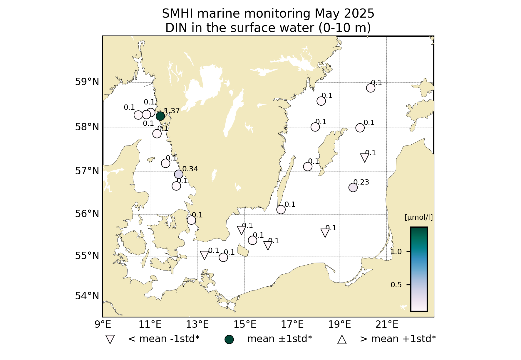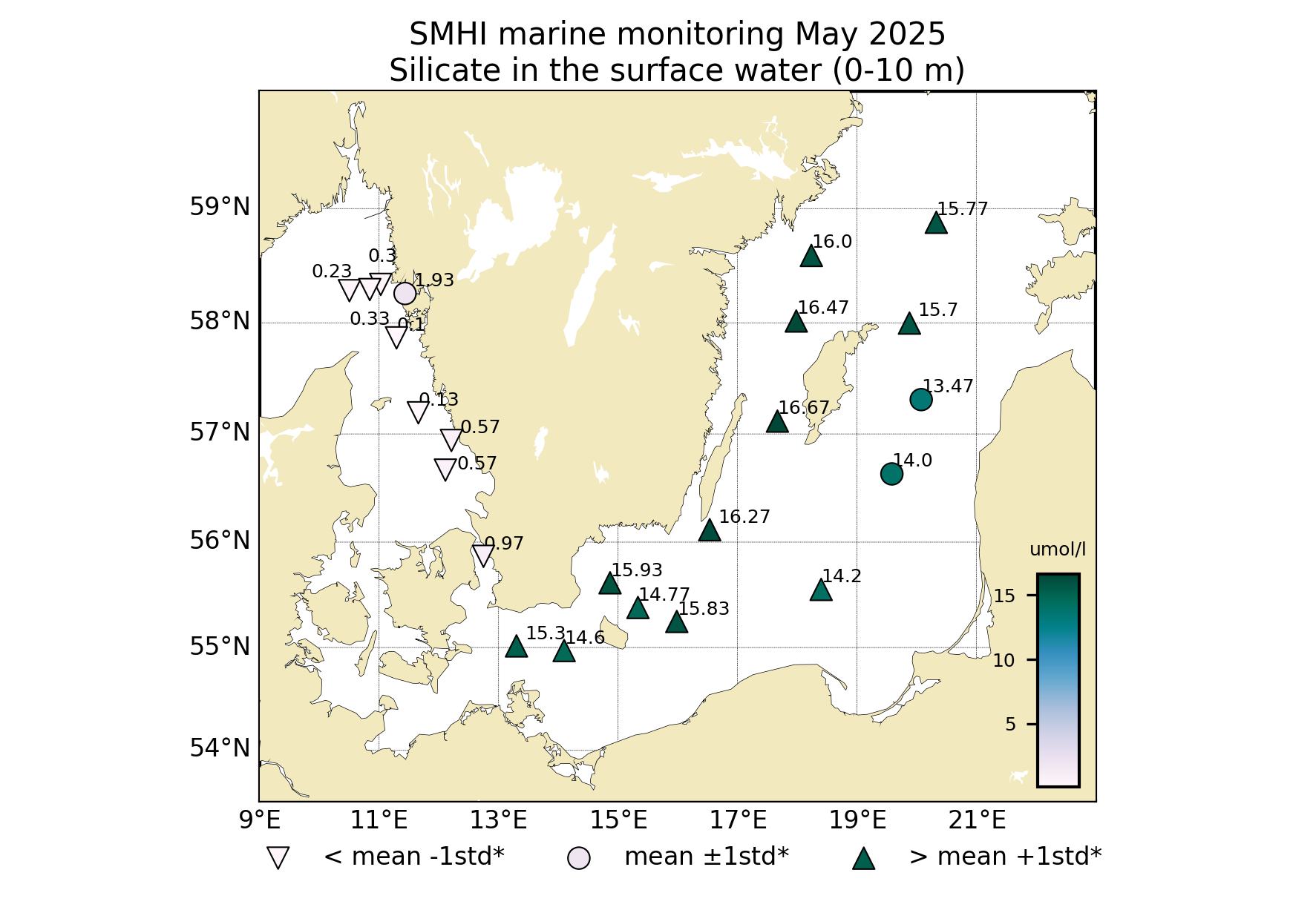 Koncentrationen av DIN i Egentliga Östersjön låg under eller nära detektionsgränsen (0,1 µmol/l) vilket var lägre än normalt för månaden. Fosfat- och silikatkoncentrationerna var däremot högre än normalt med halter omkring 0,3 – 0,6 och 14 – 16 µmol/l respektive.