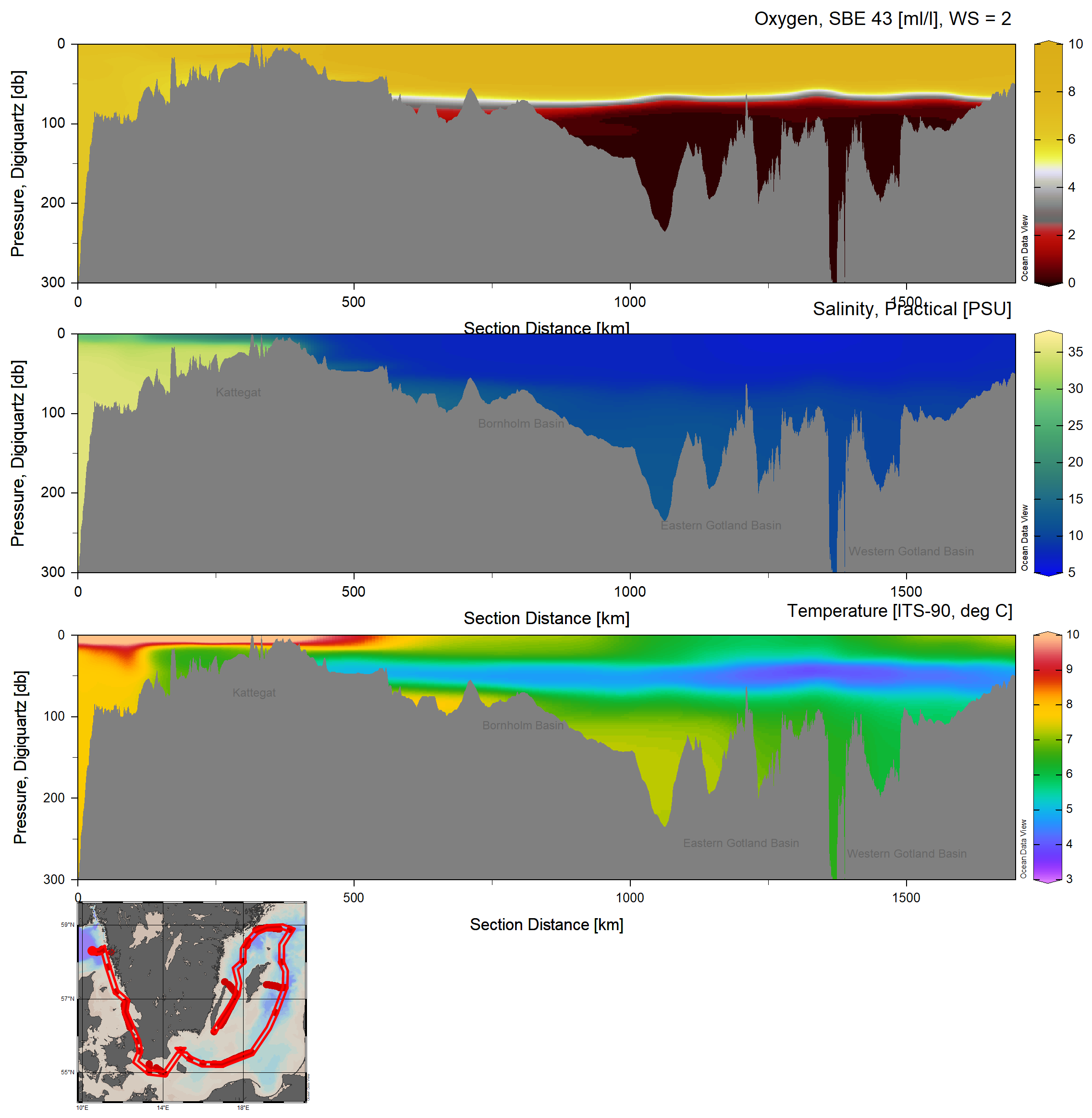 Förstora bildenFigur: Snitt som visar syrekoncentration, salthalt och temperatur från mätningar med CTD och MVP, från Skagerrak till Östra Gotlandsbassängen och vidare in i Västra Gotlandsbassängen.