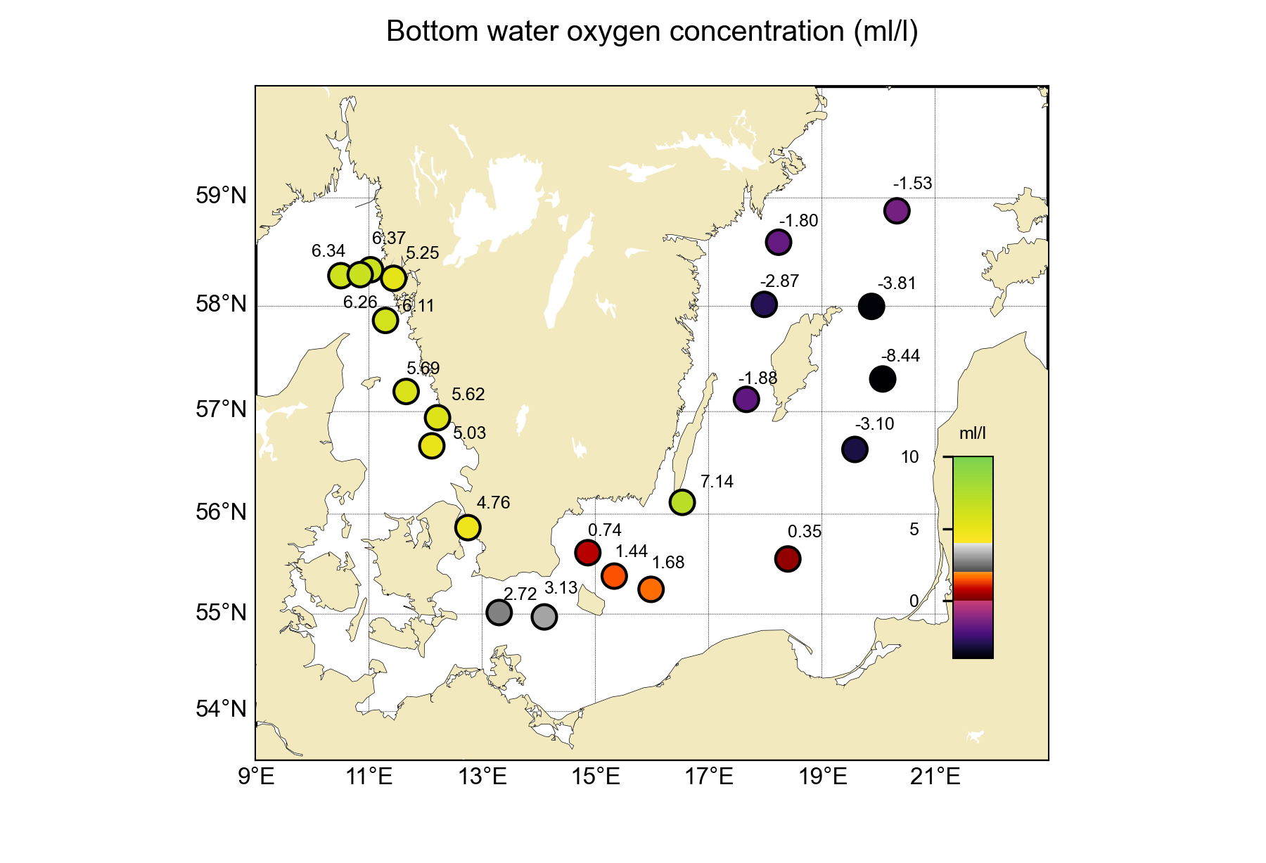 Förstora bildenFigur: Syrekoncentrationen (ml/l) i bottenvattnet.