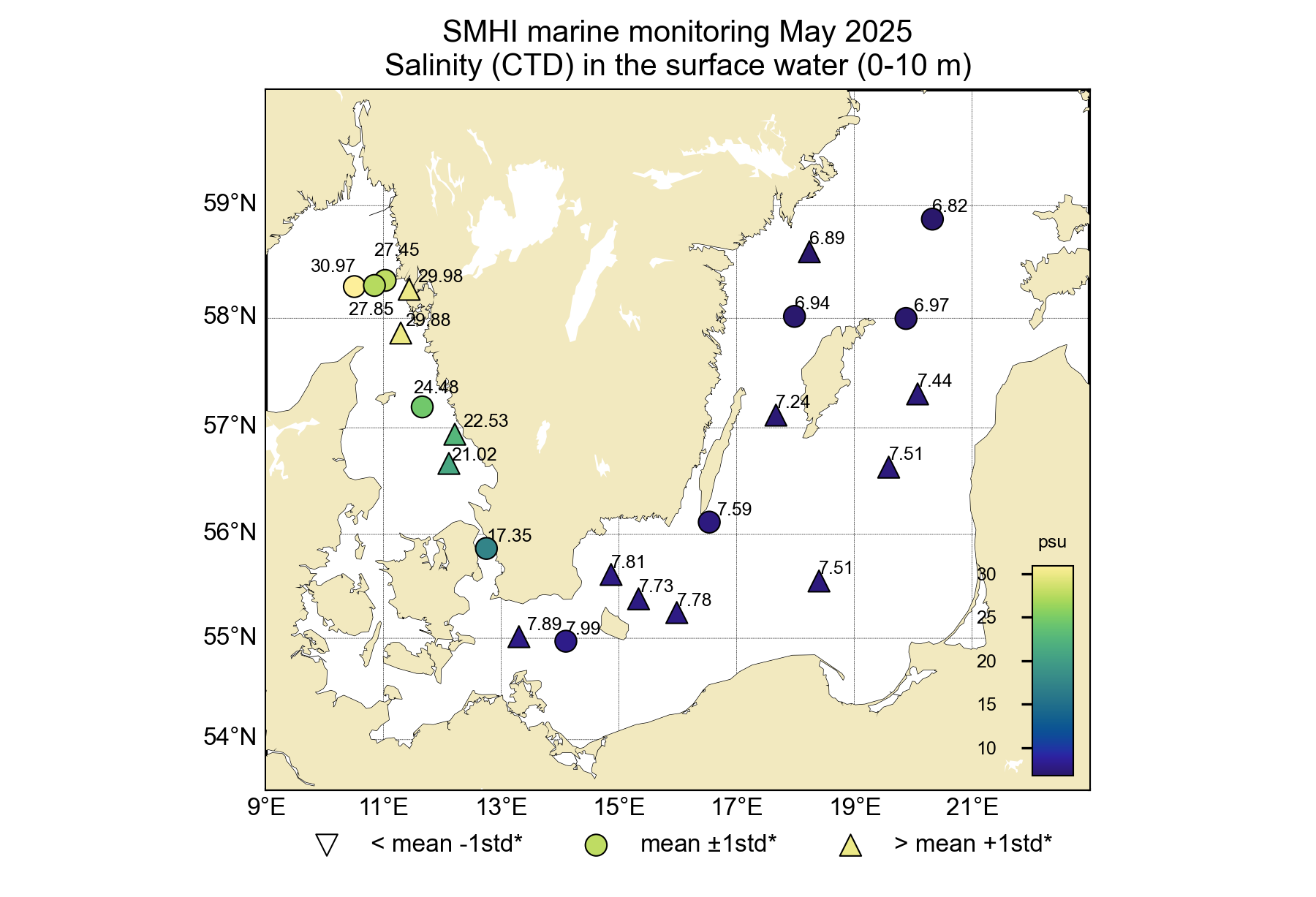 Salthalten i ytvattnet var högre än normalt för månaden i stora delar av Egentliga Östersjön. I Västerhavet var den normal eller högre än normal