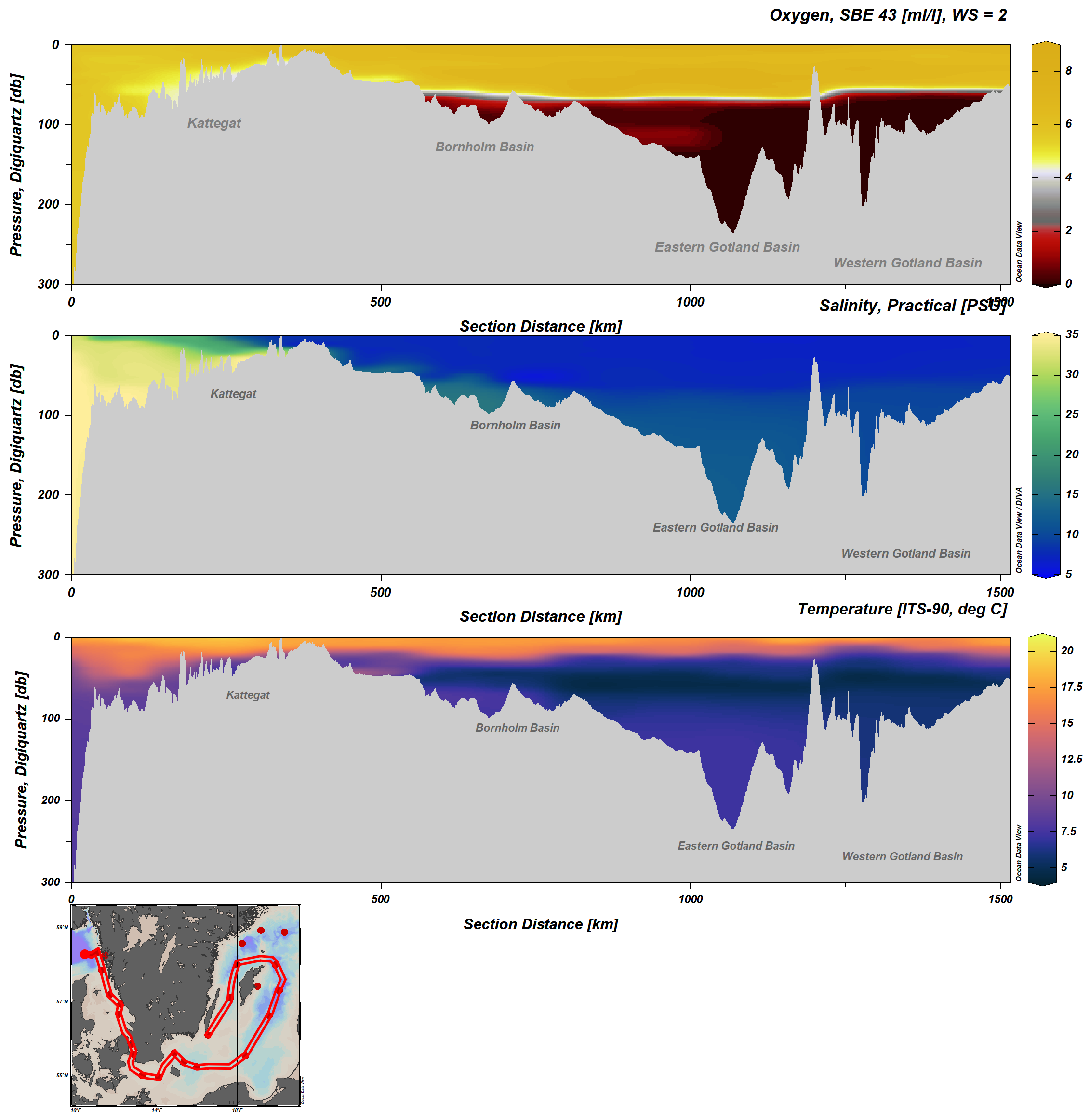 Förstora bildenFigur: Snitt som visar syrekoncentration, salthalt och temperatur från mätningar med CTD och MVP, från Skagerrak till Östra Gotlandsbassängen och vidare in i Västra Gotlandsbassängen.