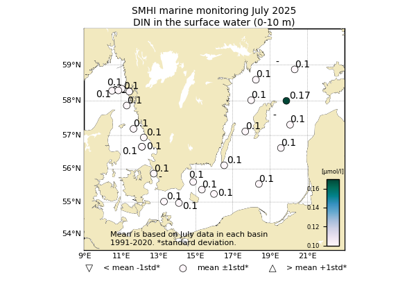 Halterna av löst oorganiskt kväve (DIN) i ytvattnet låg på nivåer under detektionsgräns, <0,10 µmol/l, på samtliga stationer, med undantag av BY20 Fårödjupet där halterna låg på 0,17 µmol/l.