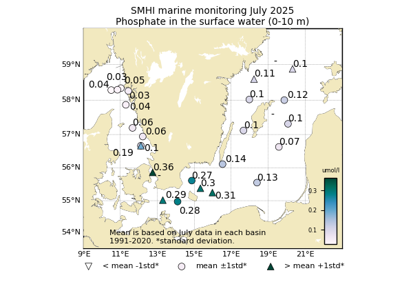 Fostfathalten i ytvattnet var normal eller något högre än normalt för säsongen, med de högre halterna uppmätt i Bornholmsbassängen och i norra Östersjön, och varierade mellan 0,1 – 0,29 µmol/l.