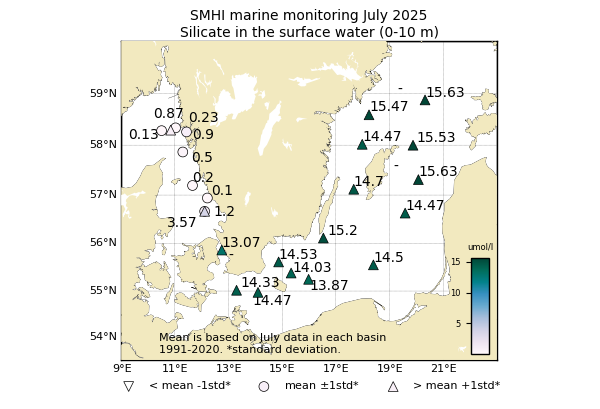 Koncentrationen av kisel i ytvattnet var över det normala på samtliga stationer, med koncentrationer mellan 14,0 – 15,6 µmol/l.