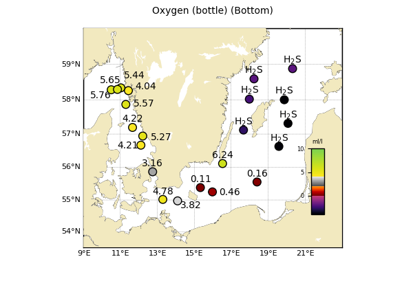 Akut syrebrist, det vill säga syrehalter mindre än 2 ml/l, noterades från 60 – 80 meter i Västra och Östra Gotlandsbassängen med undantag av den grunda stationen BY39. Svavelväte uppmättes från 70 till 80 meters djup i Västra Gotlandsbassängen och från 80 till 145 meters djup i Östra Gotlandsbassängen.