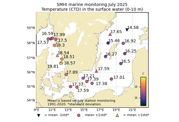 Ytvattentemperaturerna i samtliga havsområden låg runt det normala, mellan 16,3 – 19,8 ℃.