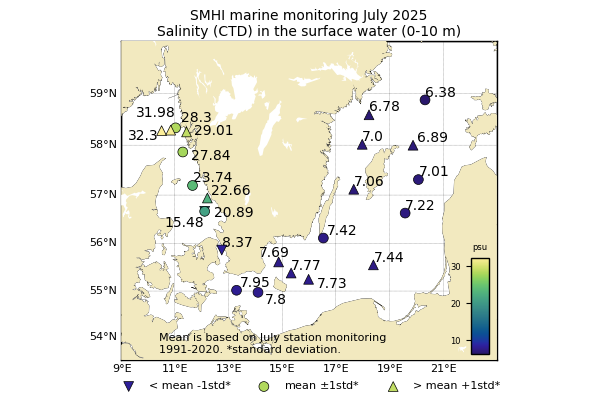 Temperaturen i ytvattnet var runt det normala i hela Östersjön, med några få undantag, med temperaturer mellan 14,6 – 17,6℃. Vid BY39 Ölands södra udde var yttemperaturen 17,6℃, vilket är högre än normalt. Salthalten i ytan var 6,4 - 7,9 psu och varierade mellan att vara normal till något över det normala i hela det undersökta området. En tydlig skiktning hade bildats i området, med en pyknoklin på ca 20 – 30 meters djup i hela området.